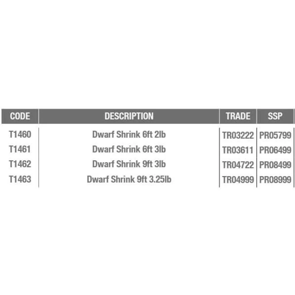 La gamme Dwarf Shrink comprend des modèles de 6 pi 2 lb et 3 lb pour les situations les plus exigeantes, avec des ébauches de 3,25 lb et 3,5 lb pour les applications grand public de gros poissons capables de traiter les plus grosses carpes et les plombs les plus lourds.