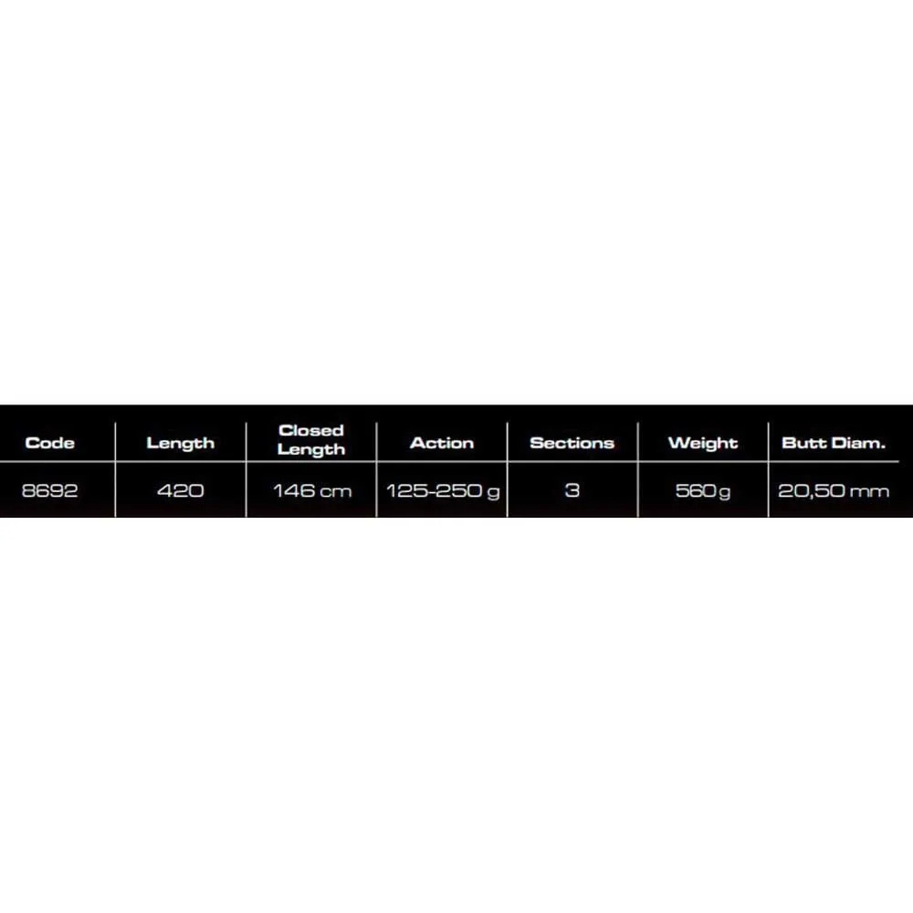C’est un produit exclusif pour les pêcheurs professionnels. Son extrême finesse et sa puissance se distinguent. Le blank est construit avec le procédé exclusif Diabraid 45 et une combinaison de carbone haut module de 40 et 60 tonnes, qui vise à transmettre toute la puissance du blank au plomb, de manière fulminante et propre, minimisant l’apparition d’éventuels rebonds pendant le casting. Il est doté du système d’embout hybride Cinnetic Flexi tip de dernière génération. Il équipe des anneaux Fuji Low rider Alconite, avec un cadre en acier inoxydable et un porte-moulinet Fuji DPS Luxe personnalisé, ainsi qu’une poignée confortable et élégante de style bol qui nous offre une prise en main parfaite. Il est servi avec une housse Soft Shell avec un zip et une poignée de suspension, ce qui nous aidera à garder notre canne à l’abri de l’humidité et des rayures.