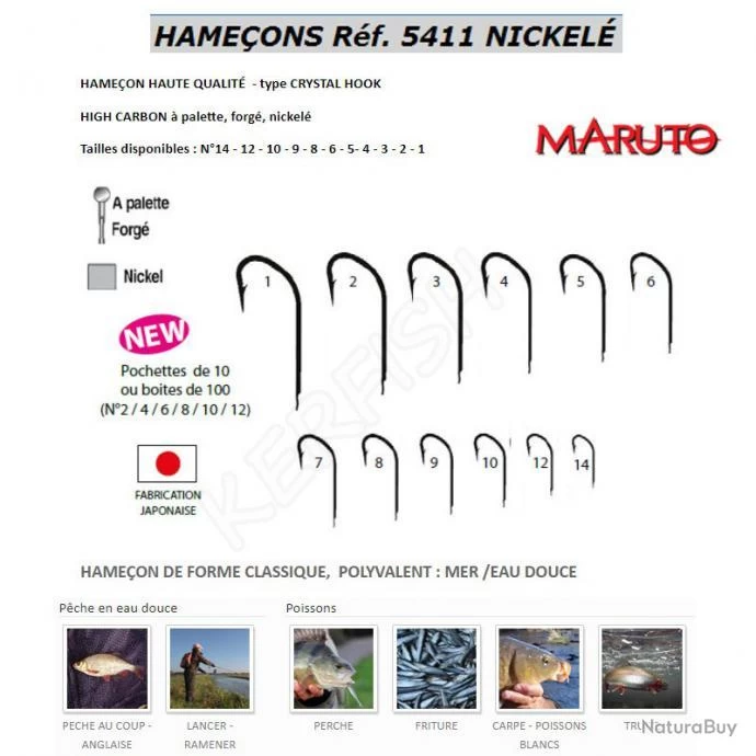 Hameçon : N° 1, 2, 3, 4, 5, 6, 7, 8, 9, 10, 12, 14
