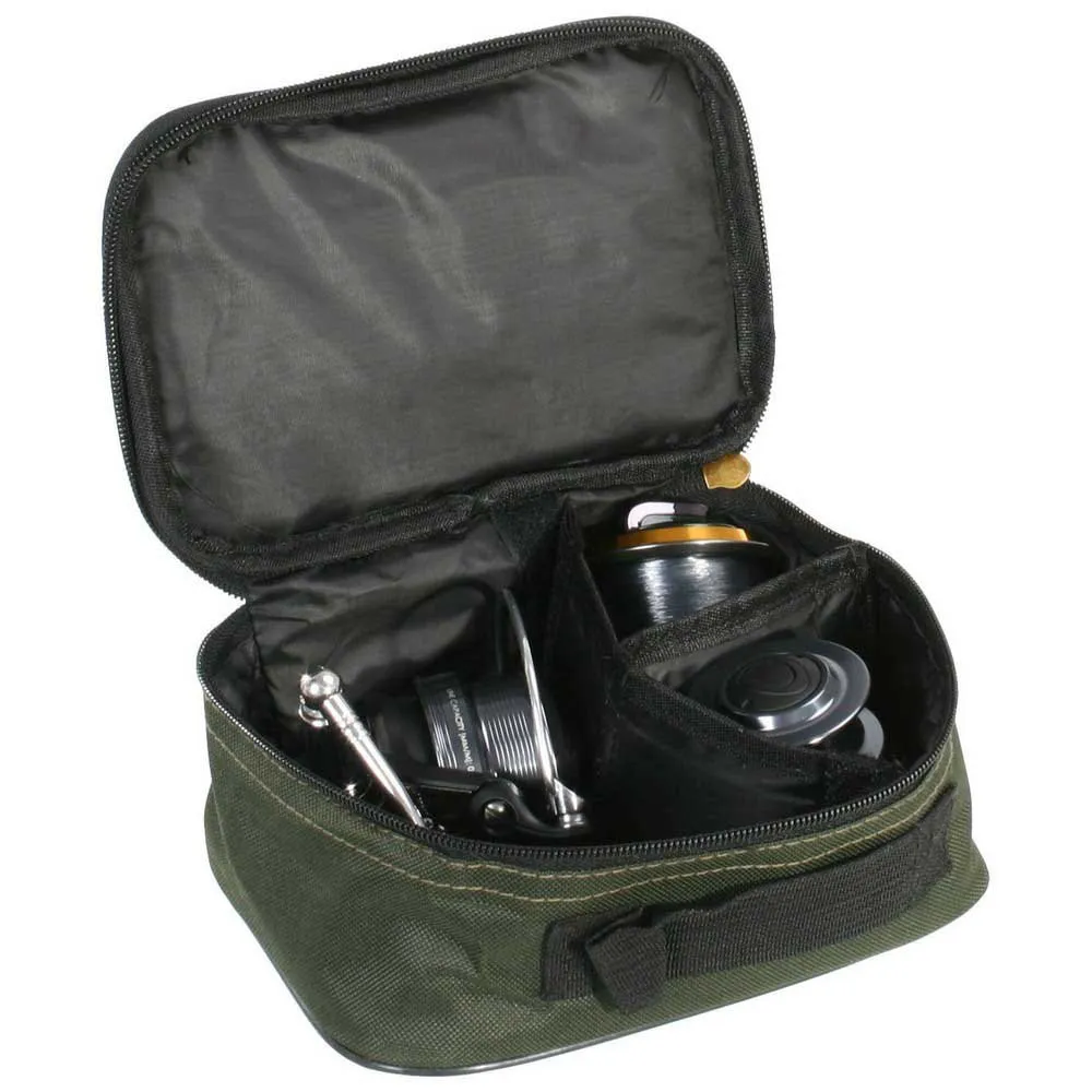 Une série d’étuis à moulinet professionnels, de différentes tailles.