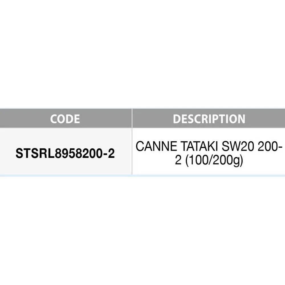 La CANNE DE TATAKI SW20 a une tige en deux Ă©lĂ©ments Ă©gaux en carbone 24T âTechnifibreâ, une poignĂ©e Ă©lastique EVA, une double poignĂ©e en mousse EVA noire, un porte-moulinet argentĂ© type VSS, des anneaux Fuji âOâ liĂ©s âConceptâ, une pointe âhybrideâ pour une sensibilitĂ© maximale et une dĂ©tection optimale des morsures et un Ă©tui en tissu.